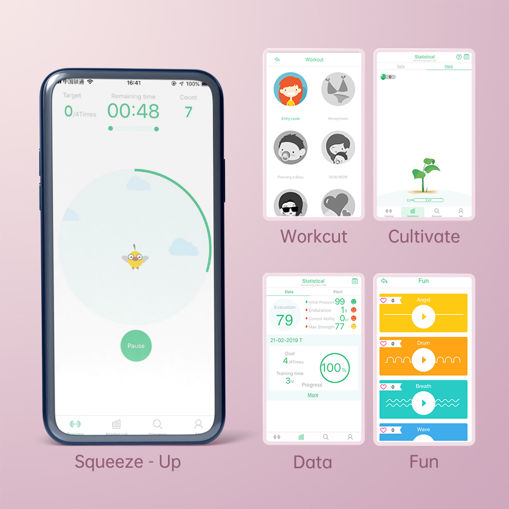 アプリケーションは、「筋肉の緊張を維持できた時間」、「持久力のレベル」、「骨盤底筋を制御する力」の進歩統計を提供します。