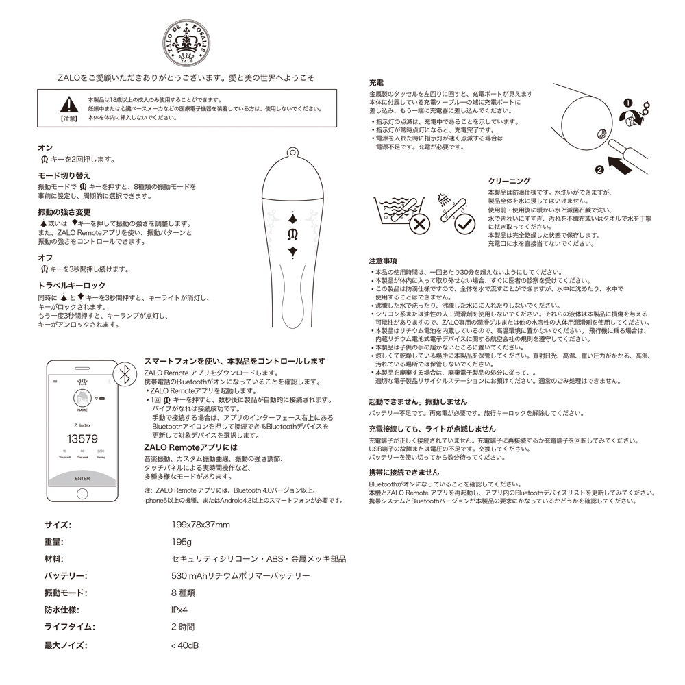 - アプリのリモートコントロール: Bluetooth接続により、ZALO アプリを使用してスマートフォンにリンクできます。個人用のリモコンとして使用するか、パートナーにスマートフンアプリを操作してもらうだけで、あなたのすべての感覚をコントロールしてもうことができます。 iOSユーザーは、Apple App Storeで「ZALO REMOTE」を検索してダウンロードしてください。 Androidユーザーは、Google Playで「ZALO REMOTE」を検索してダウンロードしてください。